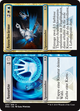 | Rules | Tap target creature. Draw a card. // Create two 1/1 colorless Thopter artifact creature tokens with flying, then you gain 1 life for each creature you control. |