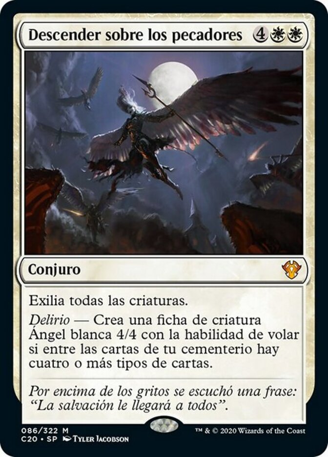 | Rules | Exile all creatures. Delirium — Create a 4/4 white Angel creature token with flying if there are four or more card types among cards in your graveyard. |