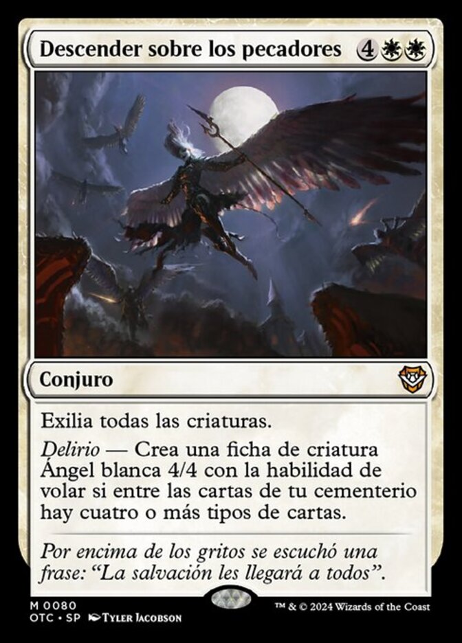 | Rules | Exile all creatures. Delirium — Create a 4/4 white Angel creature token with flying if there are four or more card types among cards in your graveyard. |