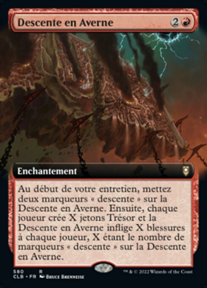 | Rules | At the beginning of your upkeep, put two descent counters on Descent into Avernus. Then each player creates X Treasure tokens and Descent into Avernus deals X damage to each player, where X is the number of descent counters on Descent into Avernus. |