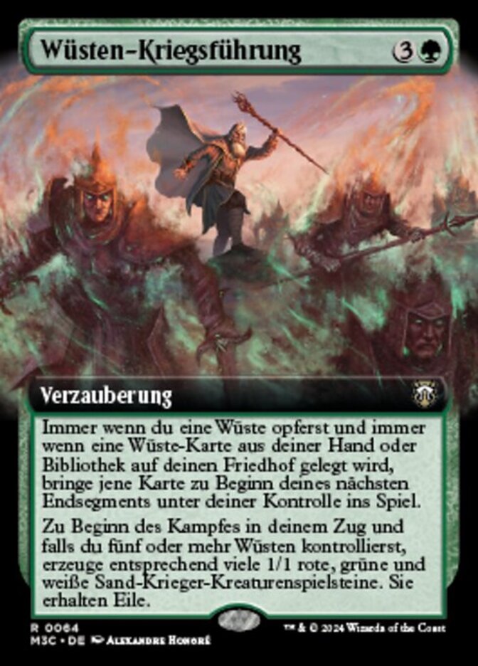 | Rules | Whenever you sacrifice a Desert and whenever a Desert card is put into your graveyard from your hand or library, put that card onto the battlefield under your control at the beginning of your next end step. At the beginning of combat on your turn, if you control five or more Deserts, create that many 1/1 red, green, and white Sand Warrior creature tokens. They gain haste. |