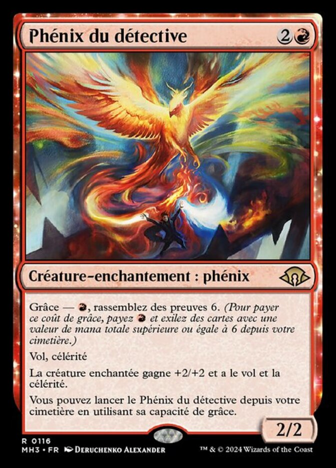 | Rules | Bestow—, Collect evidence 6. (To pay this bestow cost, pay and exile cards with total mana value 6 or greater from your graveyard.) Flying, haste Enchanted creature gets +2/+2 and has flying and haste. You may cast Detective's Phoenix from your graveyard using its bestow ability. |