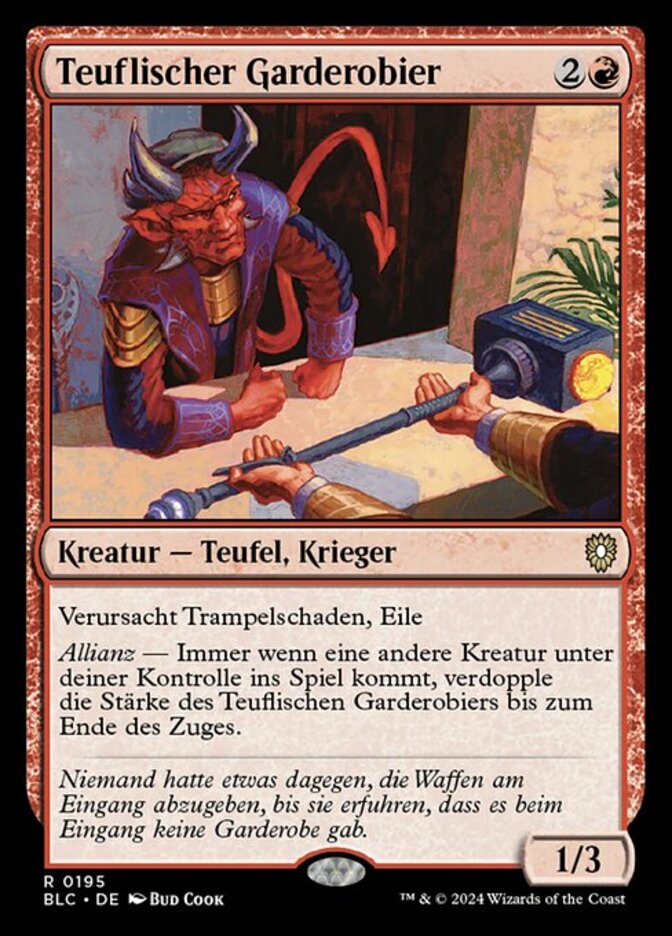 | Rules | Trample, haste Alliance — Whenever another creature enters the battlefield under your control, double Devilish Valet's power until end of turn. |