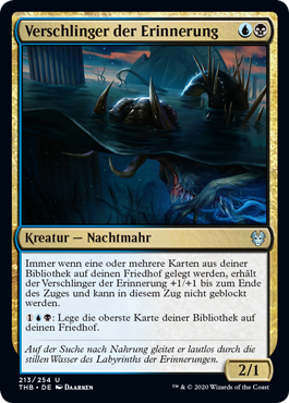 | Rules | Whenever one or more cards are put into your graveyard from your library, Devourer of Memory gets +1/+1 until end of turn and can't be blocked this turn. : Mill a card. |