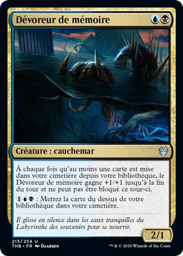 | Rules | Whenever one or more cards are put into your graveyard from your library, Devourer of Memory gets +1/+1 until end of turn and can't be blocked this turn. : Mill a card. |