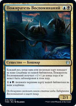 | Rules | Whenever one or more cards are put into your graveyard from your library, Devourer of Memory gets +1/+1 until end of turn and can't be blocked this turn. : Mill a card. |