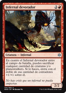 | Rules | As Devouring Hellion enters the battlefield, you may sacrifice any number of creatures and/or planeswalkers. If you do, it enters with twice that many +1/+1 counters on it. |