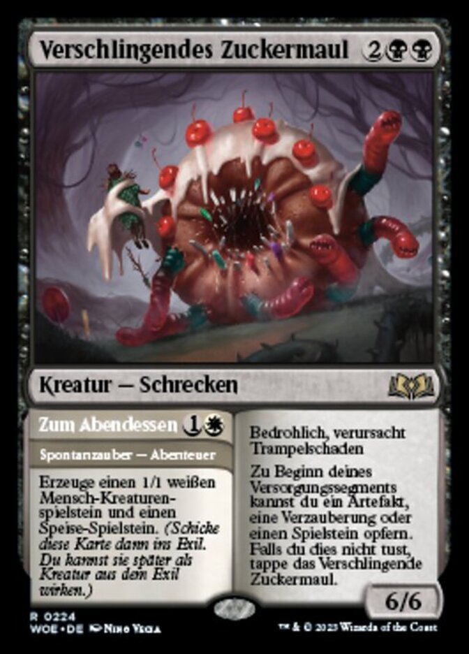 | Rules | Menace, trample At the beginning of your upkeep, you may sacrifice an artifact, enchantment, or token. If you don't, tap Devouring Sugarmaw. // Create a 1/1 white Human creature token and a Food token. (Then exile this card. You may cast the creature later from exile.) |