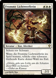 | Rules | Protection from black When Devout Lightcaster enters the battlefield, exile target black permanent. |