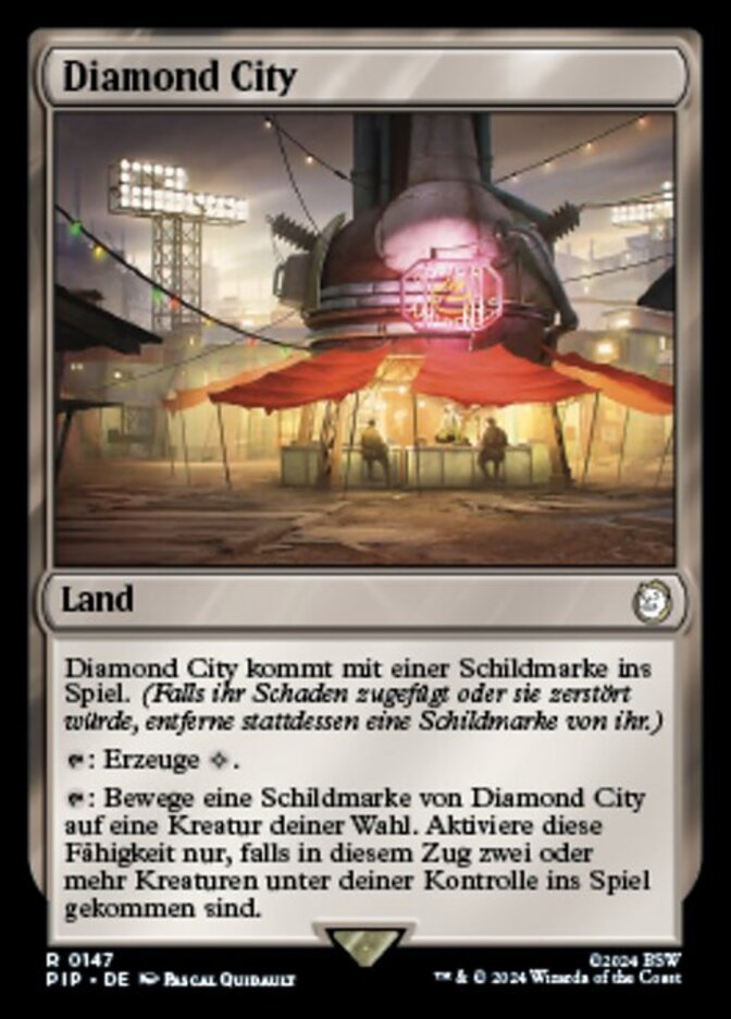 | Rules | Diamond City enters the battlefield with a shield counter on it. (If it would be dealt damage or destroyed, remove a shield counter from it instead.) : Add . : Move a shield counter from Diamond City onto target creature. Activate only if two or more creatures entered the battlefield under your control this turn. |