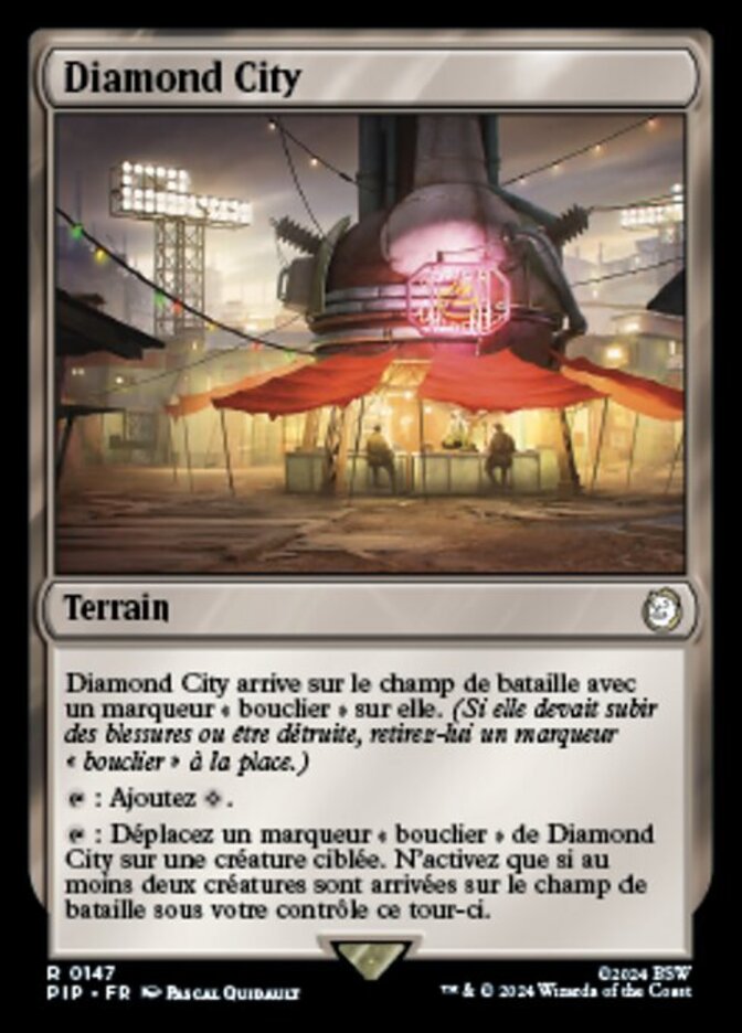 | Rules | Diamond City enters the battlefield with a shield counter on it. (If it would be dealt damage or destroyed, remove a shield counter from it instead.) : Add . : Move a shield counter from Diamond City onto target creature. Activate only if two or more creatures entered the battlefield under your control this turn. |