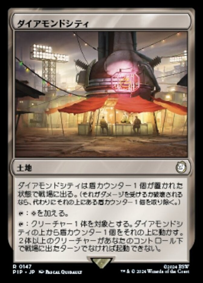 | Rules | Diamond City enters the battlefield with a shield counter on it. (If it would be dealt damage or destroyed, remove a shield counter from it instead.) : Add . : Move a shield counter from Diamond City onto target creature. Activate only if two or more creatures entered the battlefield under your control this turn. |