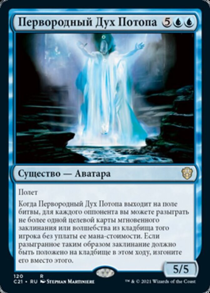 | Rules | Flying When Diluvian Primordial enters the battlefield, for each opponent, you may cast up to one target instant or sorcery card from that player's graveyard without paying its mana cost. If a spell cast this way would be put into a graveyard this turn, exile it instead. |