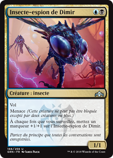 | Rules | Flying Menace (This creature can't be blocked except by two or more creatures.) Whenever you surveil, put a +1/+1 counter on Dimir Spybug. |