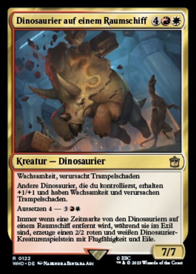 | Rules | Vigilance, trample Other Dinosaurs you control get +1/+1 and have vigilance and trample. Suspend 4— Whenever a time counter is removed from Dinosaurs on a Spaceship while it's exiled, create a 2/2 red and white Dinosaur creature token with flying and haste. |