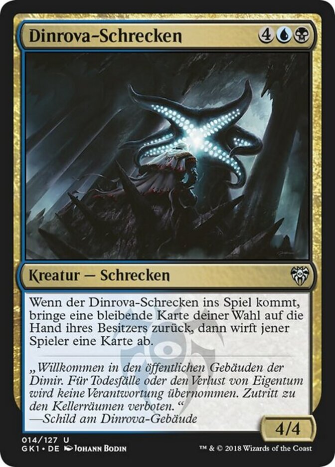 | Rules | When Dinrova Horror enters the battlefield, return target permanent to its owner's hand, then that player discards a card. |