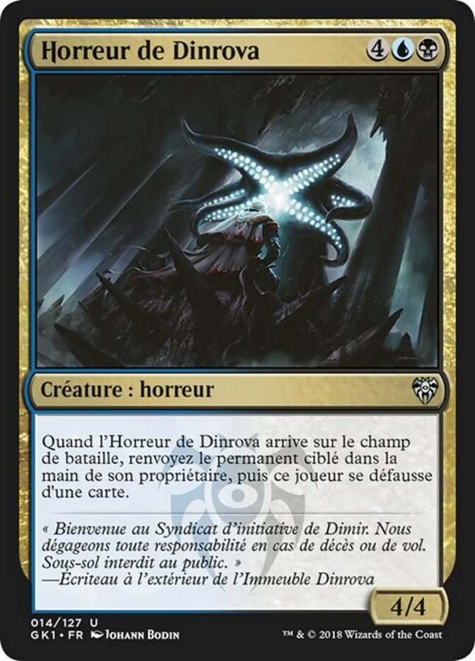 | Rules | When Dinrova Horror enters the battlefield, return target permanent to its owner's hand, then that player discards a card. |