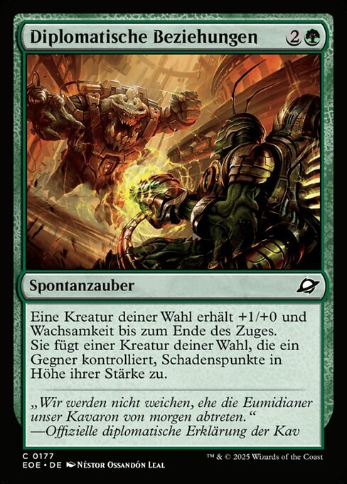 | Rules | Target creature you control gets +1/+0 and gains vigilance until end of turn. It deals damage equal to its power to target creature an opponent controls. |