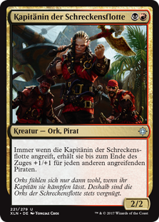 | Rules | Whenever Dire Fleet Captain attacks, it gets +1/+1 until end of turn for each other attacking Pirate. |