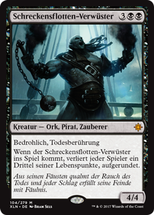 | Rules | Menace, deathtouch When Dire Fleet Ravager enters the battlefield, each player loses a third of their life, rounded up. |
