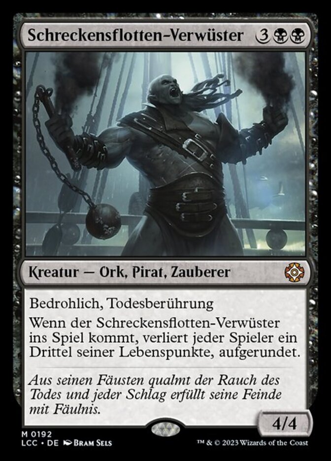 | Rules | Menace, deathtouch When Dire Fleet Ravager enters the battlefield, each player loses a third of their life, rounded up. |