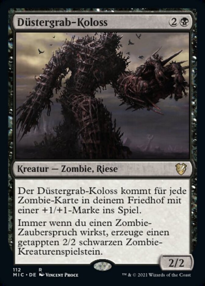 | Rules | Diregraf Colossus enters the battlefield with a +1/+1 counter on it for each Zombie card in your graveyard. Whenever you cast a Zombie spell, create a tapped 2/2 black Zombie creature token. |