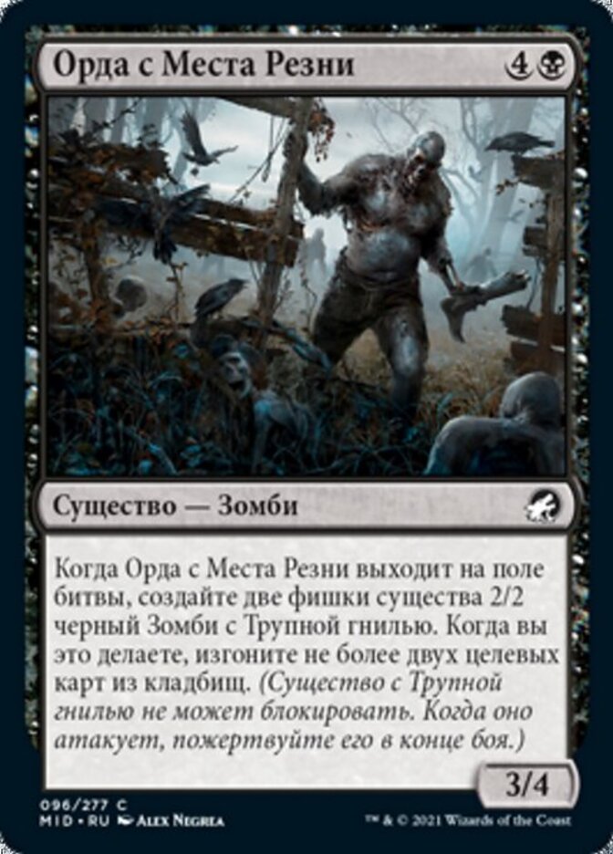 | Rules | When Diregraf Horde enters the battlefield, create two 2/2 black Zombie creature tokens with decayed. When you do, exile up to two target cards from graveyards. (A creature with decayed can't block. When it attacks, sacrifice it at end of combat.) |