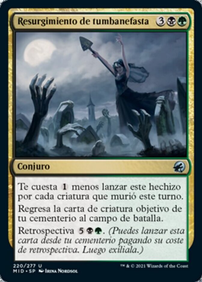 | Rules | This spell costs less to cast for each creature that died this turn. Return target creature card from your graveyard to the battlefield. Flashback (You may cast this card from your graveyard for its flashback cost. Then exile it.) |