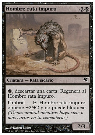 | Rules | , Discard a card: Regenerate Dirty Wererat. Threshold — As long as seven or more cards are in your graveyard, Dirty Wererat gets +2/+2 and can't block. |
