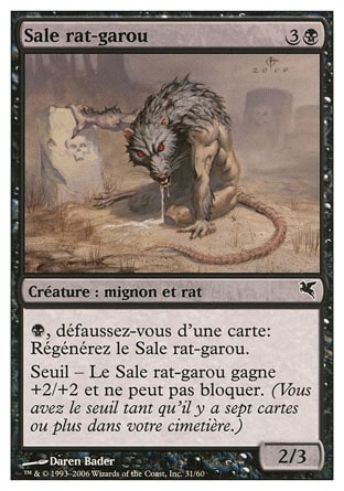 | Rules | , Discard a card: Regenerate Dirty Wererat. Threshold — As long as seven or more cards are in your graveyard, Dirty Wererat gets +2/+2 and can't block. |