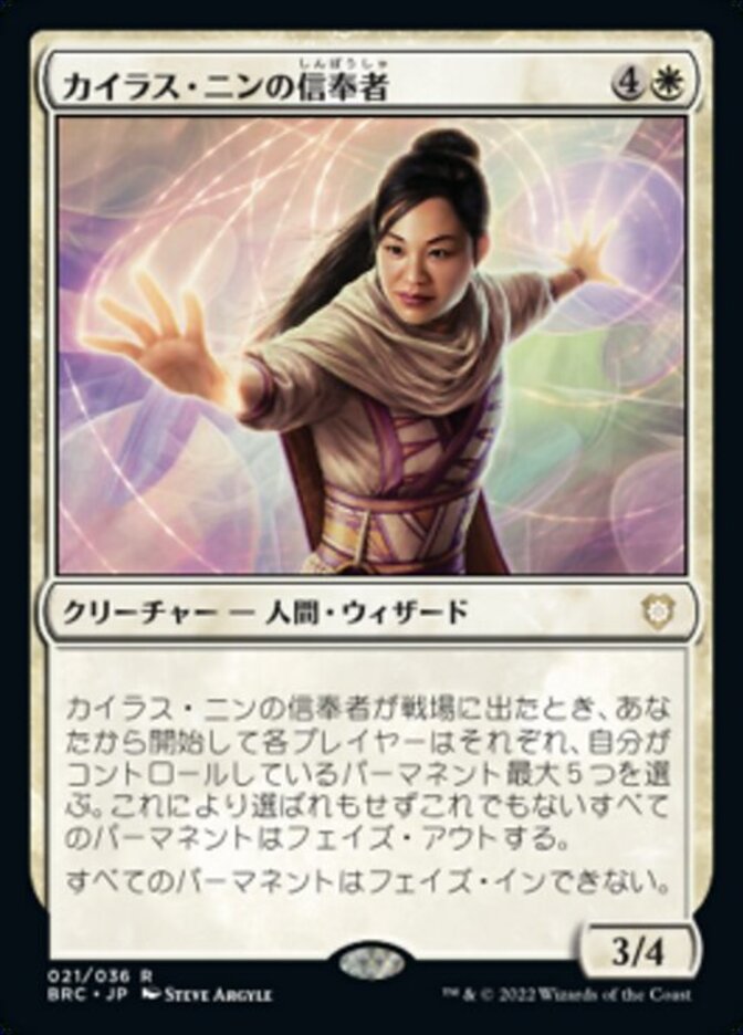 | Rules | When Disciple of Caelus Nin enters the battlefield, starting with you, each player chooses up to five permanents they control. All permanents other than Disciple of Caelus Nin that weren't chosen this way phase out. Permanents can't phase in. |