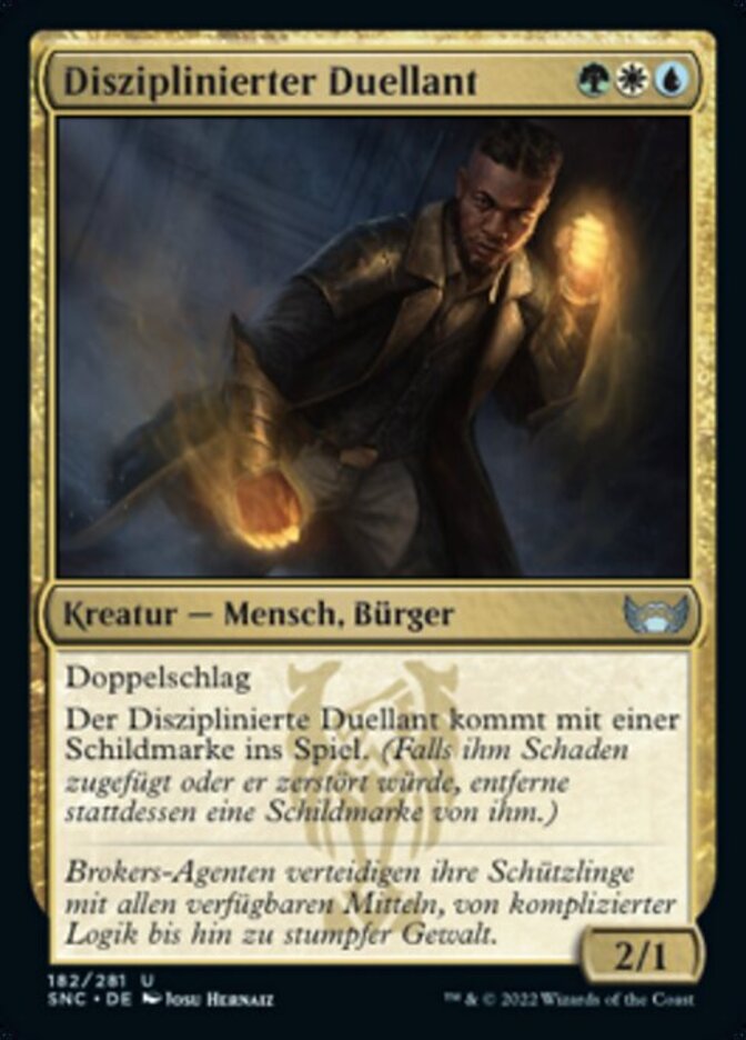 | Rules | Double strike Disciplined Duelist enters the battlefield with a shield counter on it. (If it would be dealt damage or destroyed, remove a shield counter from it instead.) |