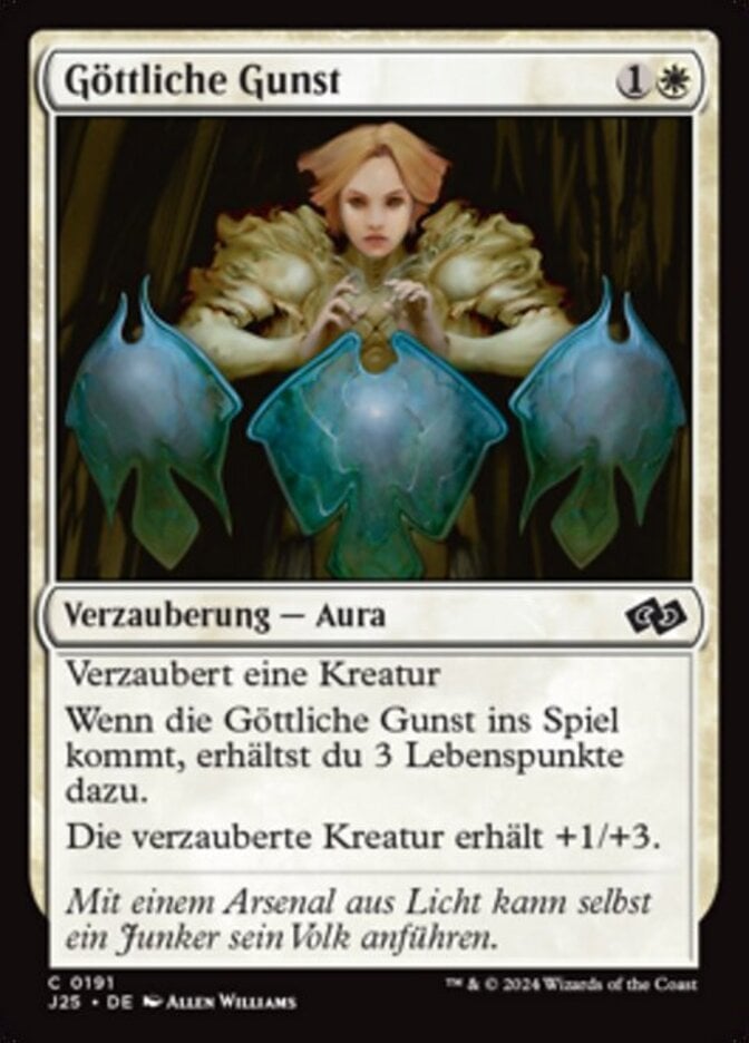 | Rules | Enchant creature When Divine Favor enters the battlefield, you gain 3 life. Enchanted creature gets +1/+3. |