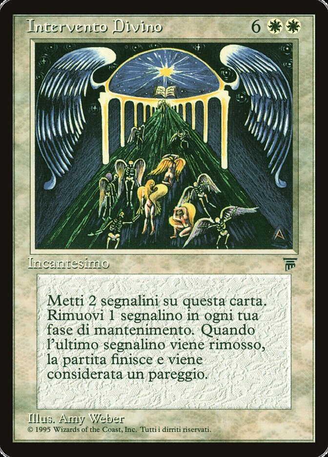 | Rules | Divine Intervention enters the battlefield with two intervention counters on it. At the beginning of your upkeep, remove an intervention counter from Divine Intervention. When you remove the last intervention counter from Divine Intervention, the game is a draw. |