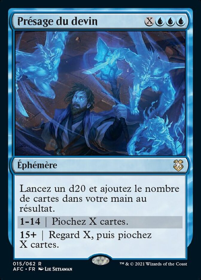 | Rules | Roll a d20 and add the number of cards in your hand. 1—14 | Draw X cards. 15+ | Scry X, then draw X cards. |