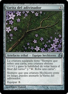 | Rules | Equipped creature has "Whenever you draw a card, this creature gets +1/+1 and gains flying until end of turn" and ": Draw a card." Whenever a Wizard creature enters the battlefield, you may attach Diviner's Wand to it. Equip |