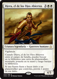 | Rules | Vigilance When Djeru, With Eyes Open enters the battlefield, you may search your library for a planeswalker card, reveal it, put it into your hand, then shuffle. If a source would deal damage to a planeswalker you control, prevent 1 of that damage. |