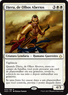 | Rules | Vigilance When Djeru, With Eyes Open enters the battlefield, you may search your library for a planeswalker card, reveal it, put it into your hand, then shuffle. If a source would deal damage to a planeswalker you control, prevent 1 of that damage. |