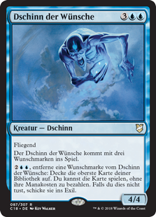 | Rules | Flying Djinn of Wishes enters the battlefield with three wish counters on it. , Remove a wish counter from Djinn of Wishes: Reveal the top card of your library. You may play that card without paying its mana cost. If you don't, exile it. |
