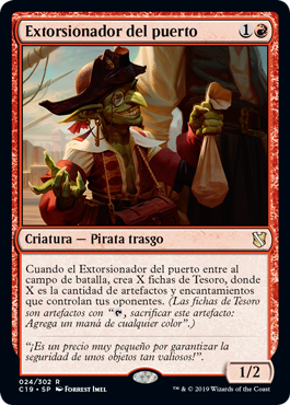 | Rules | When Dockside Extortionist enters the battlefield, create X Treasure tokens, where X is the number of artifacts and enchantments your opponents control. (Treasure tokens are artifacts with ", Sacrifice this artifact: Add one mana of any color.") |