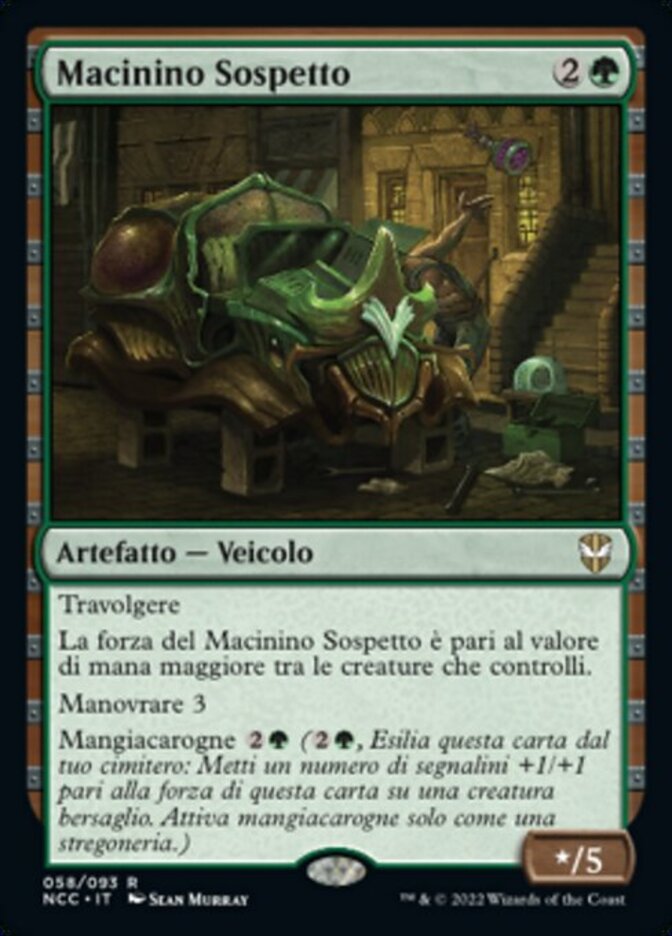 | Rules | Trample Dodgy Jalopy's power is equal to the highest mana value among creatures you control. Crew 3 Scavenge (, Exile this card from your graveyard: Put a number of +1/+1 counters equal to this card's power on target creature. Scavenge only as a sorcery.) |