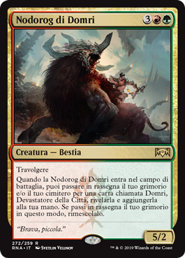 | Rules | Trample When Domri's Nodorog enters the battlefield, you may search your library and/or graveyard for a card named Domri, City Smasher, reveal it, and put it into your hand. If you search your library this way, shuffle. |