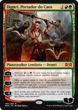 | Rules | +1: Add or . If that mana is spent on a creature spell, it gains riot. (It enters the battlefield with your choice of a +1/+1 counter or haste.) −3: Look at the top four cards of your library. You may reveal up to two creature cards from among them and put them into your hand. Put the rest on the bottom of your library in a random order. −8: You get an emblem with "At the beginning of each end step, create a 4/4 red and green Beast creature token with trample." |