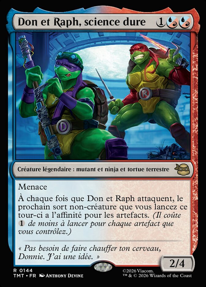 | Rules | Menace Whenever Don & Raph attack, the next noncreature spell you cast this turn has affinity for artifacts. (It costs less to cast for each artifact you control.) |
