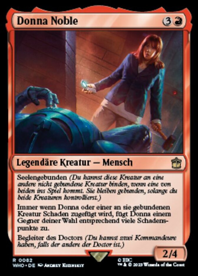 | Rules | Soulbond (You may pair this creature with another unpaired creature when either enters the battlefield. They remain paired for as long as you control both of them.) Whenever Donna or a creature it's paired with is dealt damage, Donna deals that much damage to target opponent. Doctor's companion (You can have two commanders if the other is the Doctor.) |
