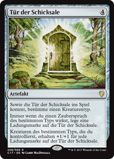 | Rules | As Door of Destinies enters the battlefield, choose a creature type. Whenever you cast a spell of the chosen type, put a charge counter on Door of Destinies. Creatures you control of the chosen type get +1/+1 for each charge counter on Door of Destinies. |