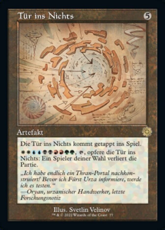 | Rules | Door to Nothingness enters the battlefield tapped. , , Sacrifice Door to Nothingness: Target player loses the game. |