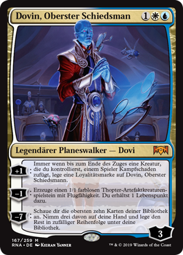 | Rules | +1: Until end of turn, whenever a creature you control deals combat damage to a player, put a loyalty counter on Dovin, Grand Arbiter. −1: Create a 1/1 colorless Thopter artifact creature token with flying. You gain 1 life. −7: Look at the top ten cards of your library. Put three of them into your hand and the rest on the bottom of your library in a random order. |
