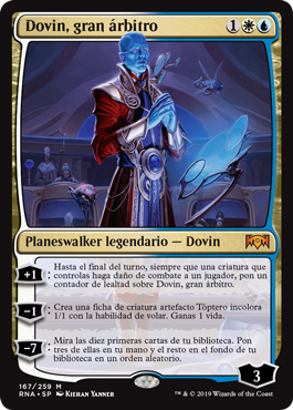 | Rules | +1: Until end of turn, whenever a creature you control deals combat damage to a player, put a loyalty counter on Dovin, Grand Arbiter. −1: Create a 1/1 colorless Thopter artifact creature token with flying. You gain 1 life. −7: Look at the top ten cards of your library. Put three of them into your hand and the rest on the bottom of your library in a random order. |