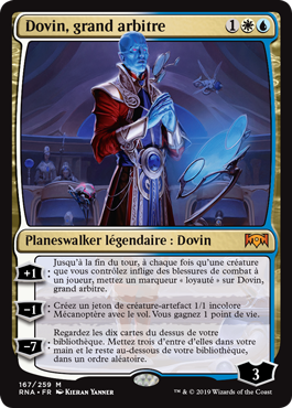 | Rules | +1: Until end of turn, whenever a creature you control deals combat damage to a player, put a loyalty counter on Dovin, Grand Arbiter. −1: Create a 1/1 colorless Thopter artifact creature token with flying. You gain 1 life. −7: Look at the top ten cards of your library. Put three of them into your hand and the rest on the bottom of your library in a random order. |